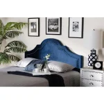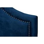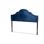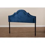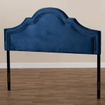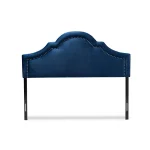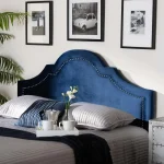 Modern and contemporary upholstered headboard Curved silhouette highlighted by silver nailheads Headboard comes with 2 pre-drilled holes (with height from ground up of 5.5″ and 8″) that go with any Leggett and Platt bedframe Upper part on the back of the headboard’s legs comes with 5 predrilled holes with 2.55″ apart from one another for height adjustment Constructed from MDF wood, LVL, and foam Velvet polyester fabric upholstery