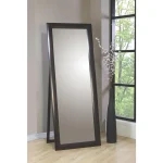 Make sure you’re looking great from head to toe with this floor mirror. This mirror is simply styled even though you may be dressed to impress. Has a stand in back to conveniently angle back for sturdy support. Stand it alone in the corner of the bedroom or dressing room as a distinguishing feature of your decor. Finished in dark cappuccino.