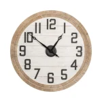 An eyecatching ring of medium brown finished wood hugs the face of this farmhouse style Time Passes Clock. The washed wood finish nicely sets the stage for the antique style hands and perfectly black numbered clock face. This piece has a touch of tradition and function for your space.
